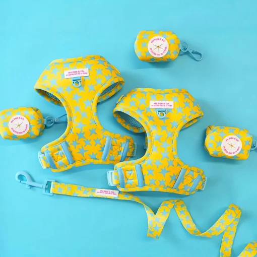 Adjustable harness at both the neck and chest, comfortably fitting dogs of all sizes. Easy to wash. Neoprene fabric on the outside. Breathable, quick-drying mesh on the inside. Metal D-ring on the back for leash attachment and on the front for ID tags. Reflective strips on the sides of the harness.
