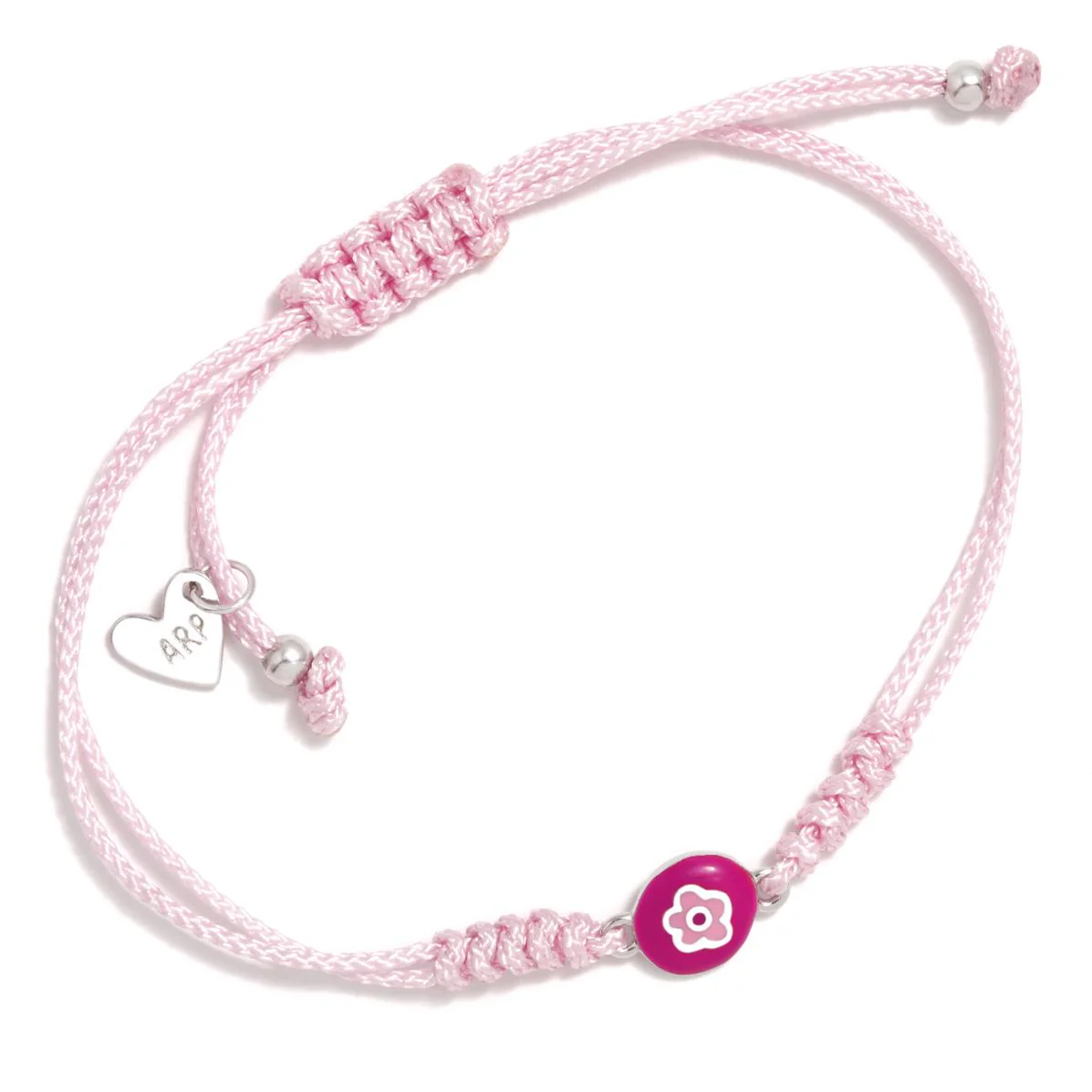 Pink cord bracelet with a fuchsia pendant and a pink flower inside. Adjustable thread bracelet with rhodium-plated, enameled sterling silver pieces. Earrings: For hygiene reasons, returns are only accepted for broken or factory-defective items.