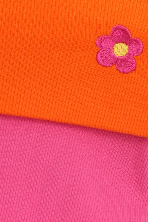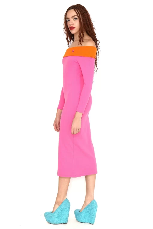 Pink ribbed slim dress with an orange boat neckline. True to size. Sizes: 36 to 44. Model’s height: 173 cm. Photo size: 38. Machine wash max 30°C. Do not bleach. Do not tumble dry. Iron max 110°C. 96% COTTON 4% ELASTANE.
