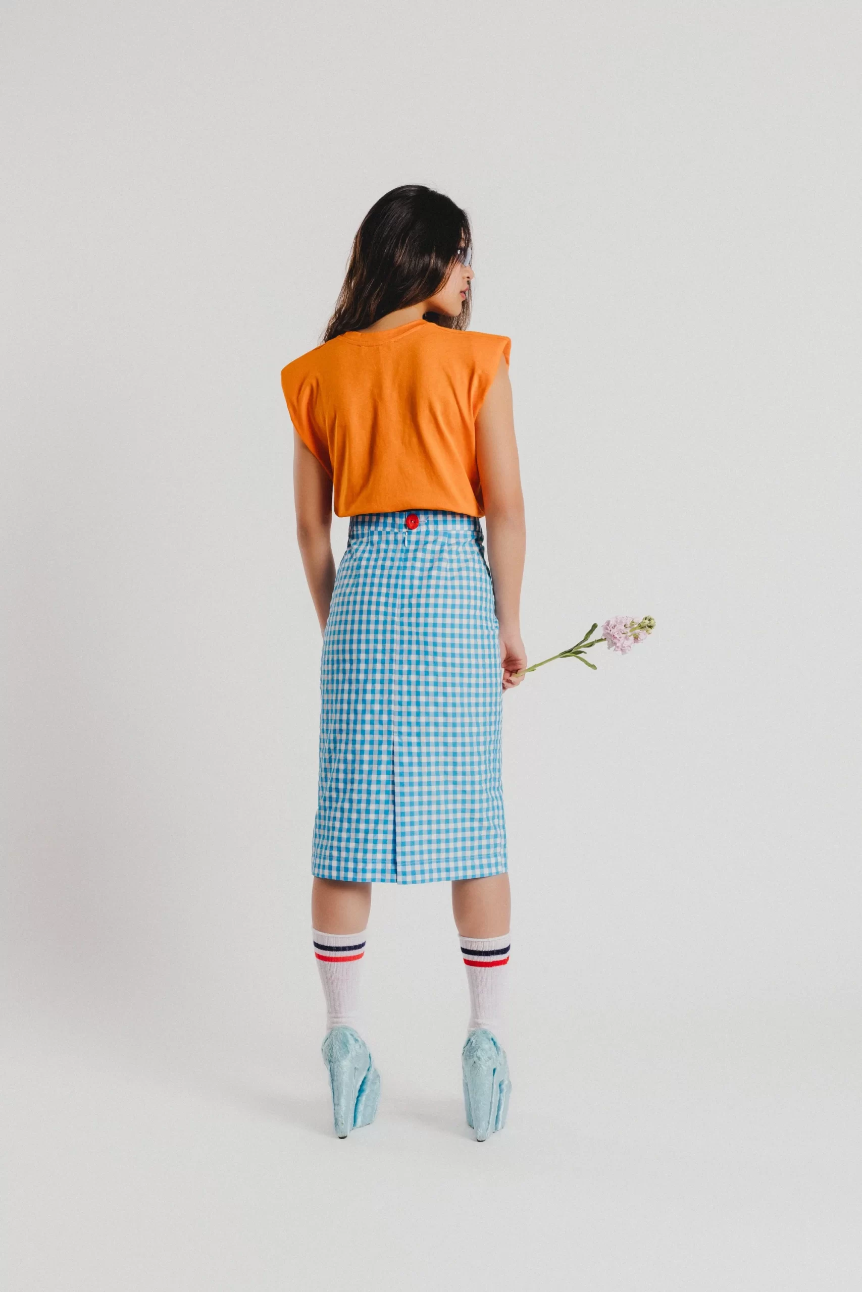 Blue gingham pencil skirt with a red heart print. Zip and button closure. Regular fit. Machine wash at a maximum temperature of 30°C. Do not bleach. Do not tumble dry. Iron inside out at a maximum temperature of 90°C. COMPOSITION: 92% POLYESTER, 8% POLYURETHANE.