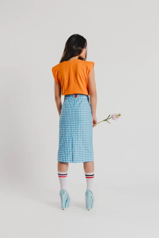 Blue gingham pencil skirt with a red heart print. Zip and button closure. Regular fit. Machine wash at a maximum temperature of 30°C. Do not bleach. Do not tumble dry. Iron inside out at a maximum temperature of 90°C. COMPOSITION: 92% POLYESTER, 8% POLYURETHANE.
