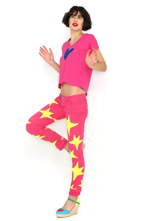 Fuchsia V-neck T-shirt with a blue heart in the center. Regular fit. Sizes: 36 to 44. Model’s height: 1’80 cm. Photo size: 38. Machine wash at 30°C. Do not bleach. Do not tumble dry. Iron at 110°C. 100% cotton.