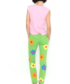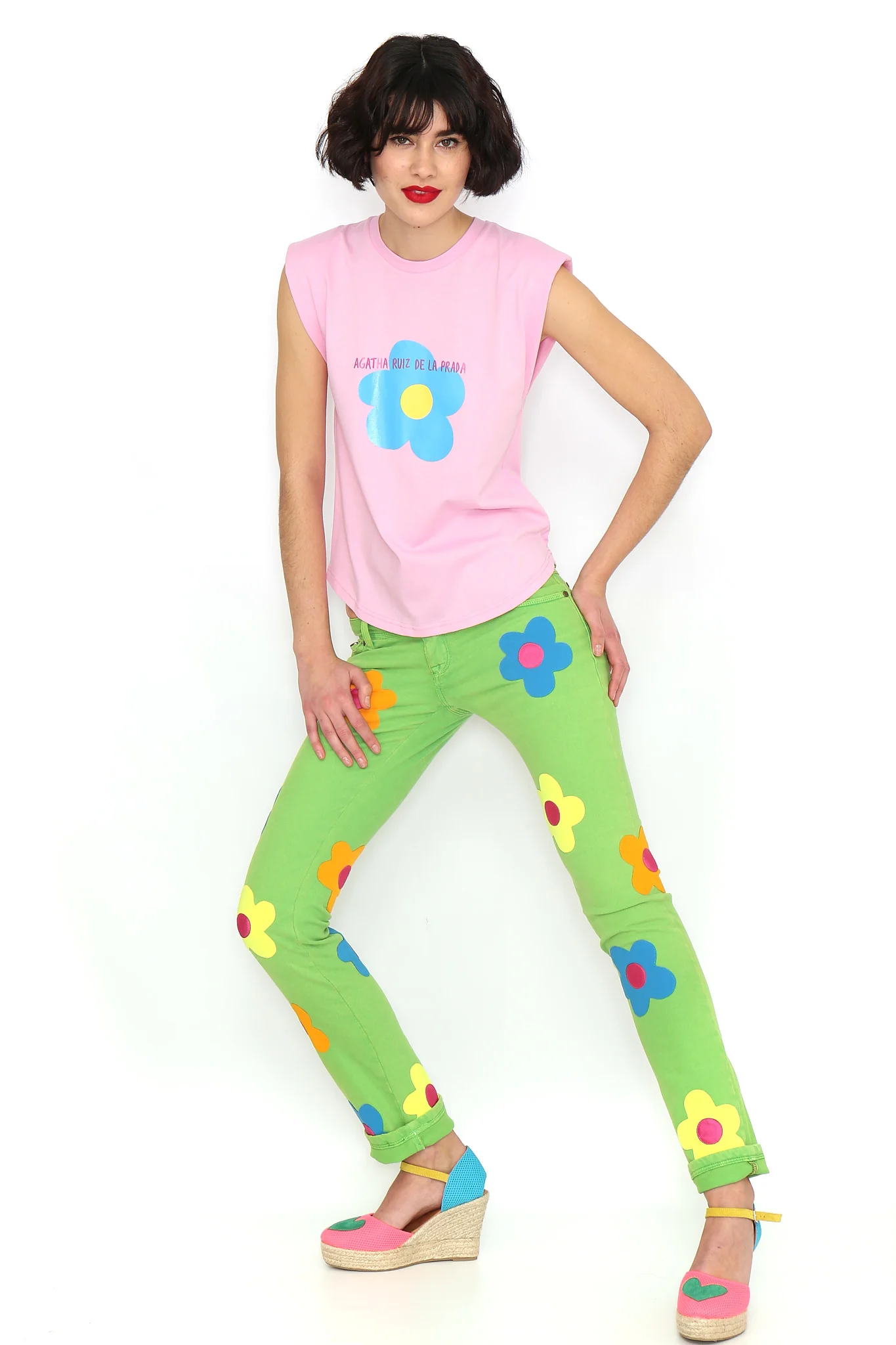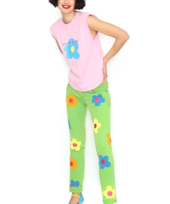 Pink sleeveless T-shirt with shoulder pads and a round neckline featuring a blue flower in the center. Regular fit. Sizes: 36 to 44. Model’s height: 1’80 cm. Photo size: 38. Machine wash max 30°C. Do not bleach. Do not tumble dry. Iron max 110°C. 100% COTTON.