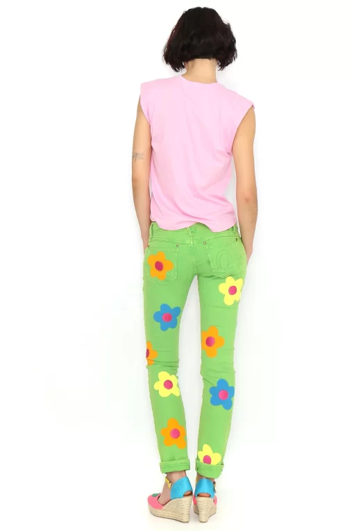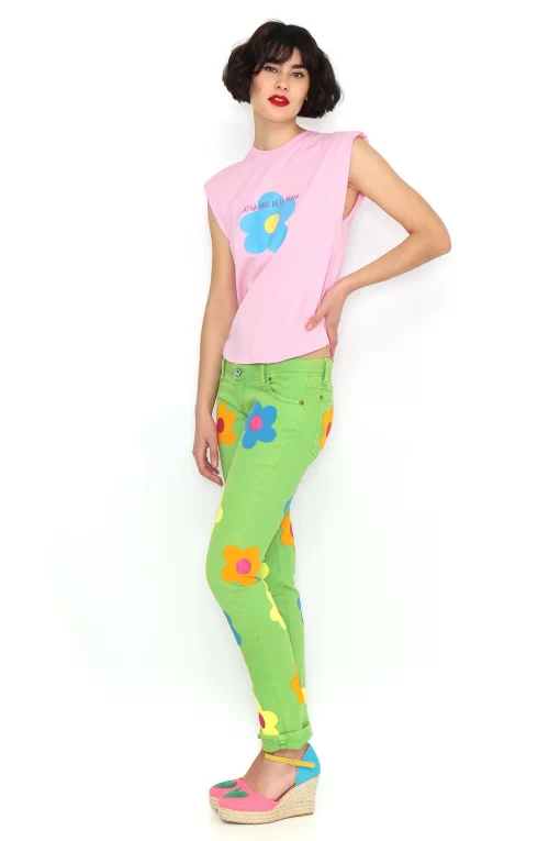 Pink sleeveless T-shirt with shoulder pads and a round neckline featuring a blue flower in the center. Regular fit. Sizes: 36 to 44. Model’s height: 1’80 cm. Photo size: 38. Machine wash max 30°C. Do not bleach. Do not tumble dry. Iron max 110°C. 100% COTTON.