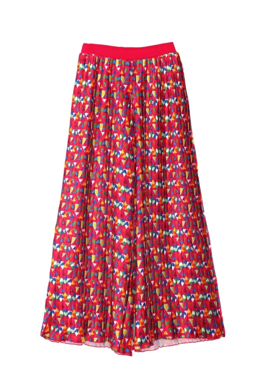 Pleated trousers with a printed pattern featuring colorful triangles and an elastic waistband in fuchsia. Sizes: 36-S / M- 40-L / XL. Machine wash max 30°C. Do not bleach. Do not tumble dry. Iron max 110°C. Composition: 97% POLYESTER 3% ELASTANE.