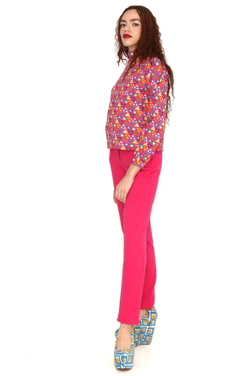Long-sleeved, high-neck T-shirt with a colorful triangle print. Regular fit. Sizes: 36 to 44. Model’s height: 173 cm. Photo size: 38. Machine wash max 30°C. Do not bleach. Do not tumble dry. Iron max 110°C. 96% COTTON 4% SPANDEX.